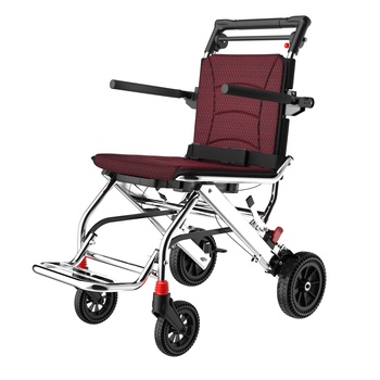 Sedia a rotelle da trasporto pieghevole con freni a mano e cerchi da 8 pollici, telaio argento, tappezzeria rosso scuro